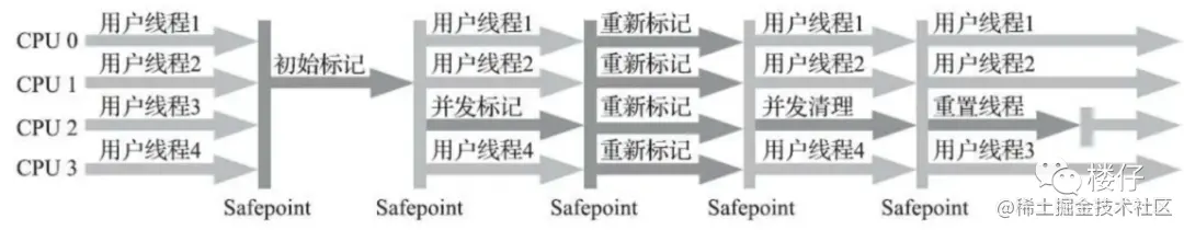CMS 收集器设计的初衷是为了消除 Parallel(怕儿喽) 收集器和 Serial(c哦瑞) 收集器 Full gc 周期中的长时间停顿。CMS收集器在 Minor gc 时会暂停所有的应用线程,并以多线程的方式进行垃圾回收。