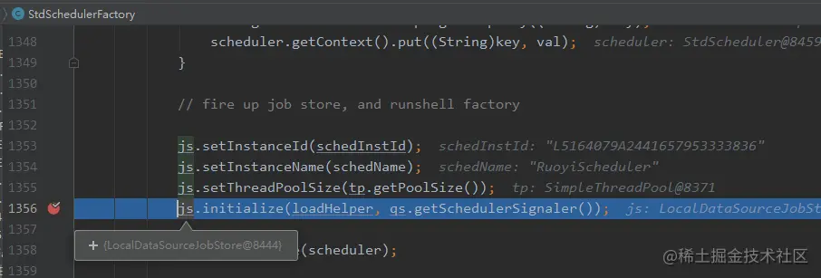 我们先来打断点看看,这里实际使用到的是哪个类的实例,先将springboot版本改回到2.1.1.RELEASE看看,可以看到使用的是LocalDataSourceJobStore,而当我们使用springboot2.5.14版本时,这里使用的是JobStoreTX是实例化对象。