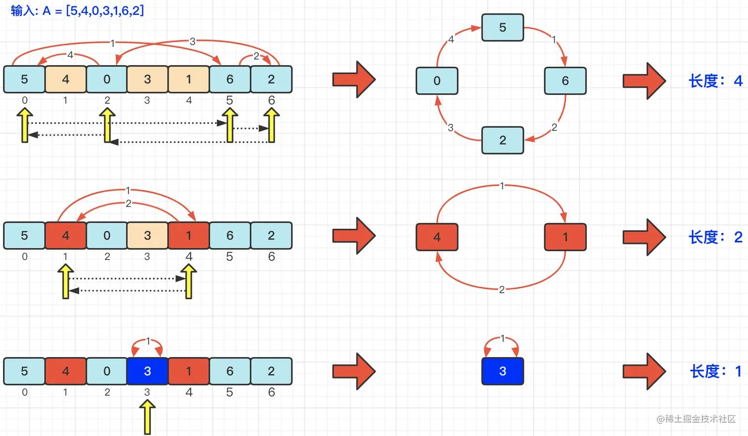 索引从0开始长度为N的数组A,包含0到N-1的所有整数。找到最大的集合S并返回其大小,其中 S[i] = {A[i], A[A[i]], A[A[A[i]]], ... }且遵守以下的规则。