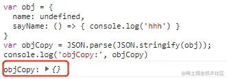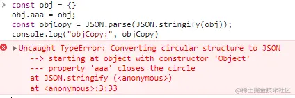const objCopy = JSON.parse(JSON.stringify(obj)); // 这里直接报错:Uncaught TypeError: Converting circular structure to JSON--> starting at object with constructor 'Object'--- property 'aaa' closes the circleat JSON.stringify
