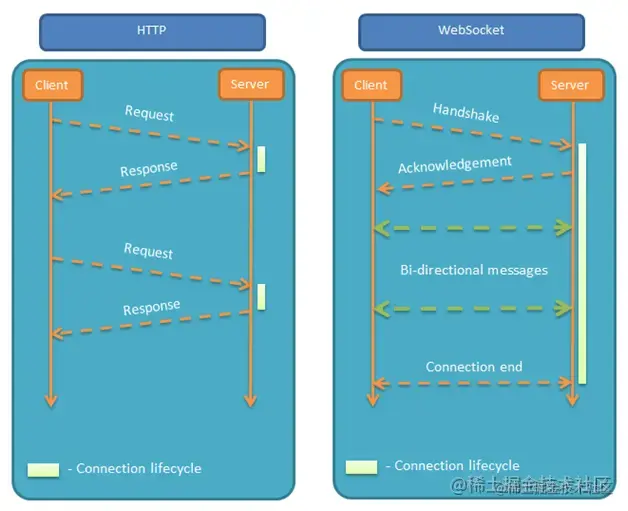 下面一张图说明了 HTTP 与 WebSocket 的主要区别: