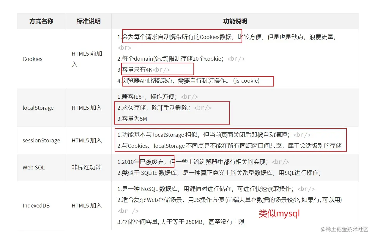 面试官:浏览器数据存储的方式 刘传V9_5_27 2022-07-17 143 阅读1分钟 前端数据存储的方式有哪些? cookie 没有兼容性问题 只有4kb 自动携带到http请求头 localStorage 永久存储,除非手动删除 5MB sessionStorage 5MB 关闭浏览器就没有,只会对当前标签页有效果 适用于敏感数据 web sql 废弃了 indexDB 类似mysql 相当于浏览器端的数据库