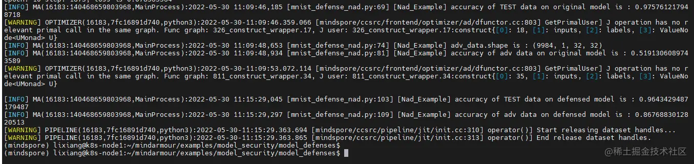 训练结果:测试集在原模型上的分类准确率为97.576,FGSM对抗样本在原模型上的分类准确率为51.913,误分类率48%左右,说明原模型对于对抗样本鲁棒性较差,测试集在防御模型上的分类准确率为96.434%,FGSM生成的对抗样本在防御后模型上的分类准确率为86.769%,误分类率不足14%,说明NAD防御确实是有效的。