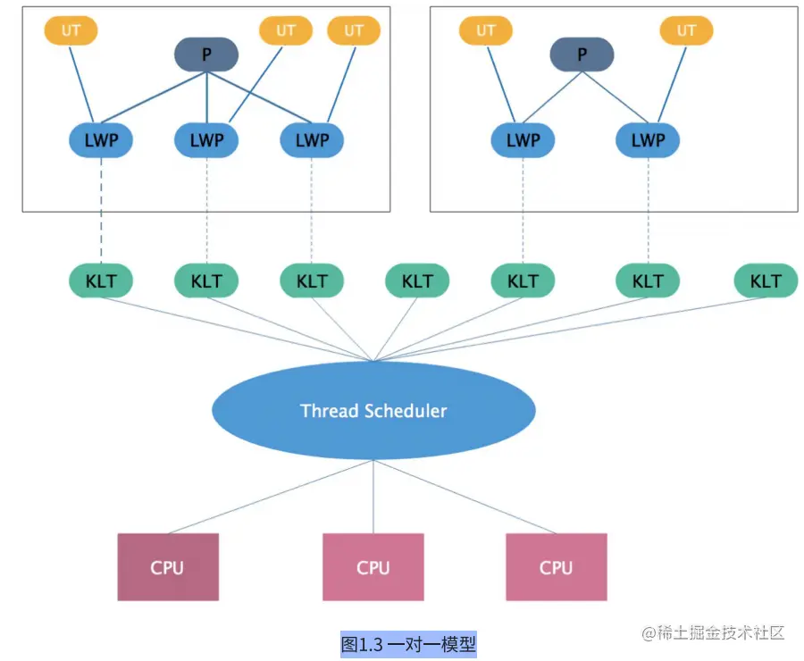 - UT=用户线程;LWP=轻量级进程;KLT=内核线程