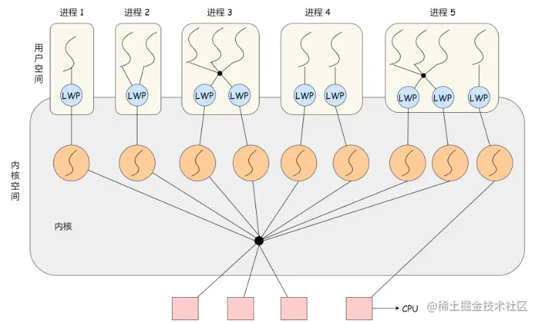 轻量级进程(Light-weight process,LWP)是内核支持的用户线程,一个进程可有一个或多个 LWP,每个 LWP 是跟内核线程一对一映射的