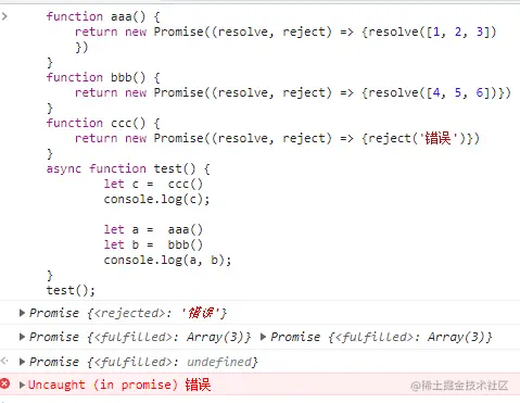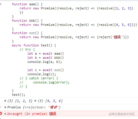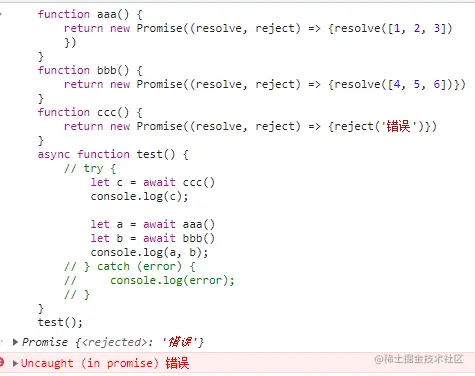 - 通常我们会用try catch捕获错误,配合使用,,如果有reject状态,就不走下面的代码了,直接走catch,这样就不会控制台报错了,也能定位是什么错