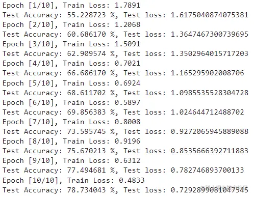 同样地,测试技术与训练程序没有什么不同,除了计算梯度之外,因为我们没有更新任何权重。我们在代码中加入了 torch.no grad()因为不需要计算梯度。接下来我们用我们的模型来预测每一批,并计算其中有多少是正确的: