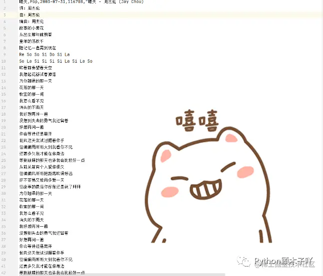 writer.writerow([i["歌曲名"],i["流派"],i["发行时间"],i["评论数"],i["歌词"]])