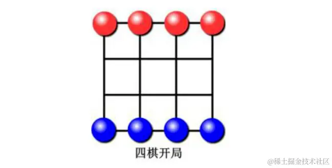 在一个4×4的棋盘上,双方各有4子,分别摆放在棋盘两个最上面的两端线的四个位置上。下图