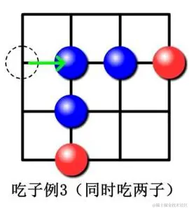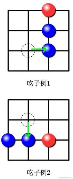 的这两子相连,乙方的子与甲方那两子中的一个子相连,那么乙方的这个子就被吃掉。