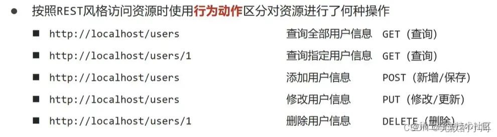 package com.example.controller; import org.springframework.stereotype.Controller; import org.springframework.web.bind.annotation.PathVariable; import org.springframework.web.bind.annotation.RequestMapping; import org.springframework.web.bind.annotation.RequestMethod; import org.springframework.web.bind.annotation.ResponseBody; @Controller public class UserController { //增加 //http://localhost:8080/users POST请求 @RequestMapping(value = "/users",method = RequestMethod.POST) @ResponseBody public String save(){ System.out.println("user save"); return "{'module':'user save'}"; } //删除 //http://localhost:8080/users/1 DELETE请求 @RequestMapping(value = "/users/{id}",method = RequestMethod.DELETE) @ResponseBody public String delete(@PathVariable Integer id){ System.out.println("user delete"+id); return "{'module':'user delete'}"; } //修改 //http://localhost:8080/users PUT请求 @RequestMapping(value = "/users",method = RequestMethod.PUT) @ResponseBody public String update(){ System.out.println("user update"); return "{'module':'user update'}"; } //查询单个 //http://localhost:8080/users/1 GET请求 @RequestMapping(value = "/users/{id}",method = RequestMethod.GET) @ResponseBody public String getById(@PathVariable Integer id){ System.out.println("user select"); return "{'module':'user select'}"; } //查询多个 //http://localhost:8080/users GET请求 @RequestMapping(value = "/users",method = RequestMethod.GET) @ResponseBody public String getAll(){ System.out.println("user selectAll"); return "{'module':'user selectAll'}"; } }