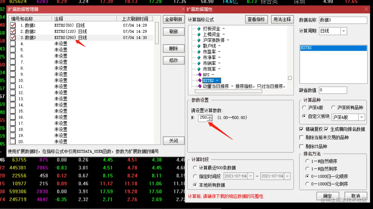 扩展数据3,和扩展数据1方法一样,N 值填 250 则是计算 250 日的 rps 强度值。