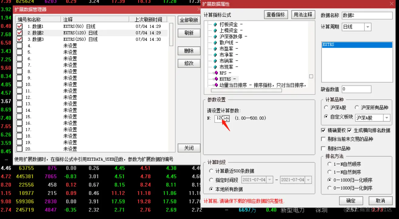 扩展数据2,和扩展数据1方法一样,N 值填 120 则是计算 120 日的 rps 强度值。