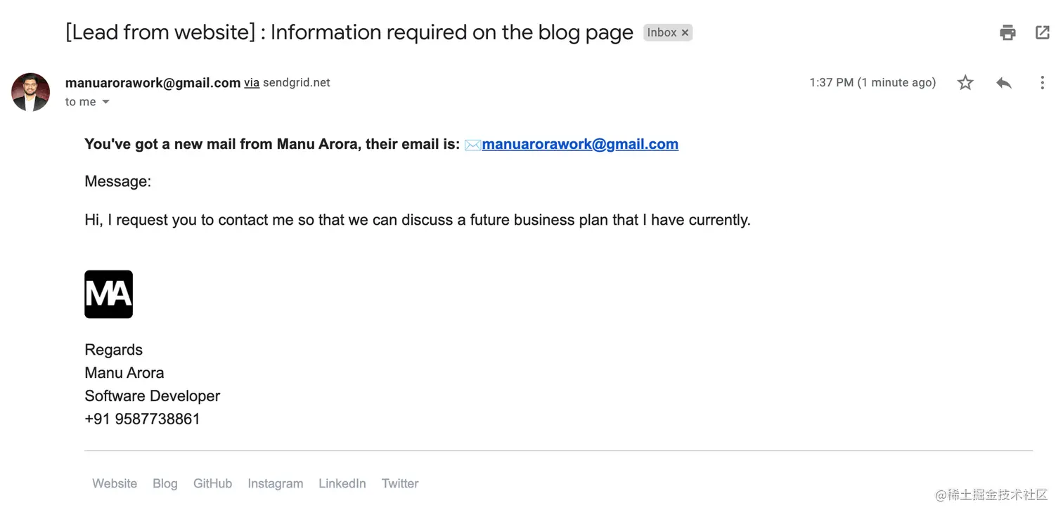 我花了大约一个小时从头开始构建这个应用程序--这都要感谢Next.js、TailwindCSS和SendGrid极其直观的工作流程和API语义。此外,还要感谢Tailwind Master Kit提供的漂亮的联系页面用户界面。