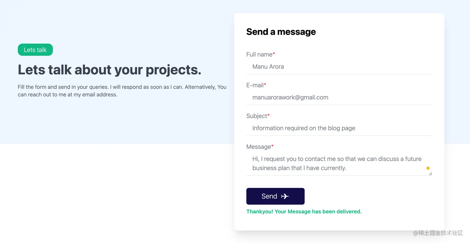 当表单成功交付时,我们在用户界面上得到一个漂亮的响应。为了传递这个响应,我们有showSuccessMessage 和showFailureMessage 状态。如果来自后端API路由的响应不包含属性error ,这意味着表单提交成功,电子邮件已经被发送。