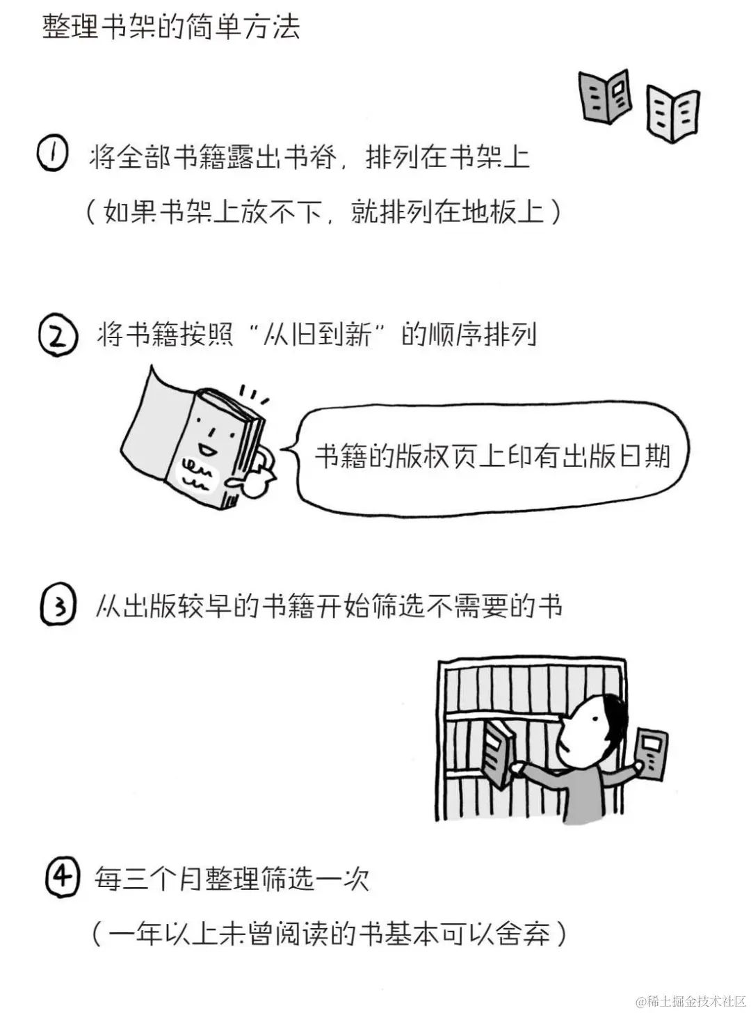 多读的方法⑥ 管理书籍篇:“可以处理的书籍”的判定方法。显露书脊和按出版时间排序是基本原则。按照从旧到新的顺序排列。如果已经过时,可以毫不犹豫地处理掉。 -71页