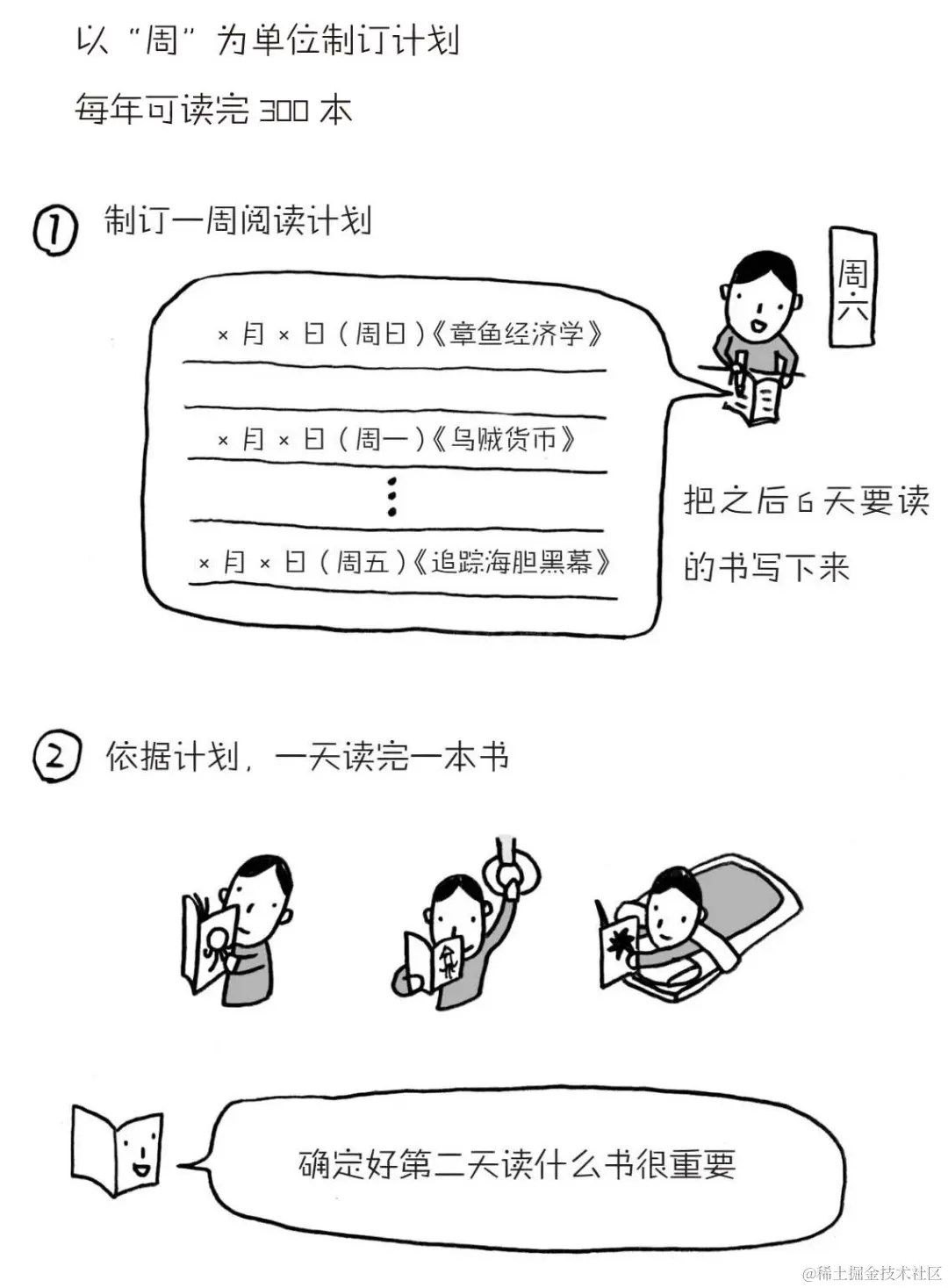 多读的方法① 选择书籍篇:制订一周阅读计划,一日一本视同等闲。“一周6本”,以“一天一本”为基准。余下的这一天,便是“自由日”。你可以把它设定为“非读书日”,也可以用来仔细品读自己喜欢的书籍,不必顾虑时间,以及制订下一周的读书计划。 -58页