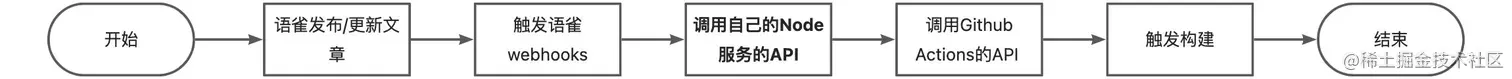 所以就打算自己搭建一个node服务,自己调用Github Actions的API触发构建。流程如下:
