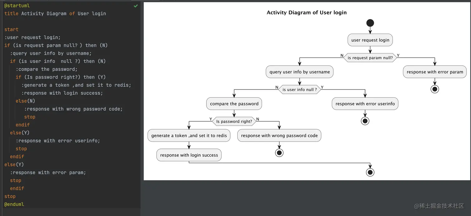 start表示活动图流程的开始stop表示活动图流程的结束:user request login;:表示活动流程节点为user request login,需要加:和;的哈if+then+endif表示一个完整的条件判断