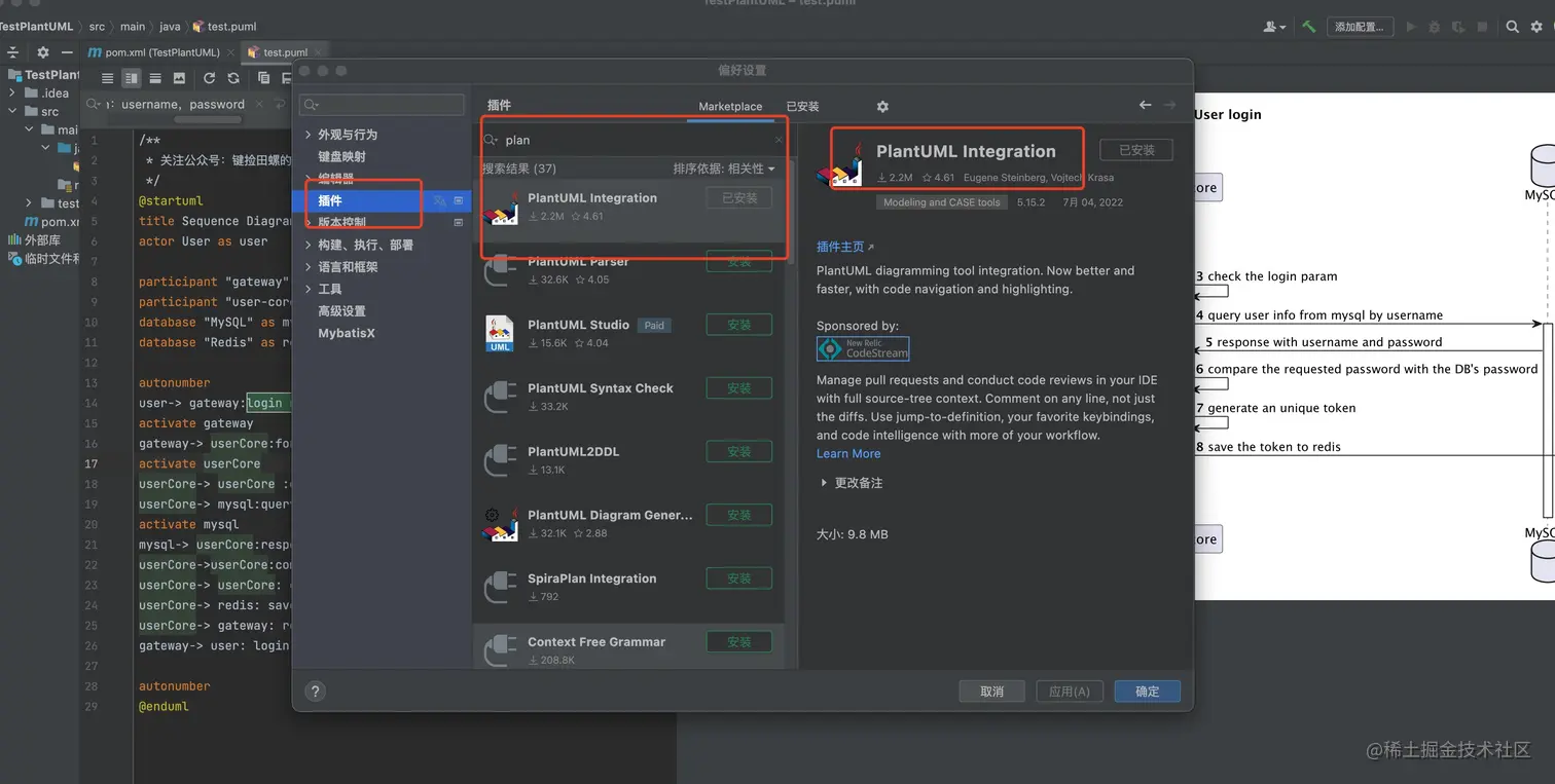 PlantUML的安装很方便的.有个插件,名字是:PlantUML Integration,大家可以去IDE的插件市场,搜索安装即可,如下: