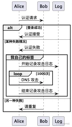 当然,PlantUML功能挺丰富的,它还可以组合消息,虽然在我的登录时序图还没体现出来. 它提供了alt/else、opt、loop来组合消息.如下: