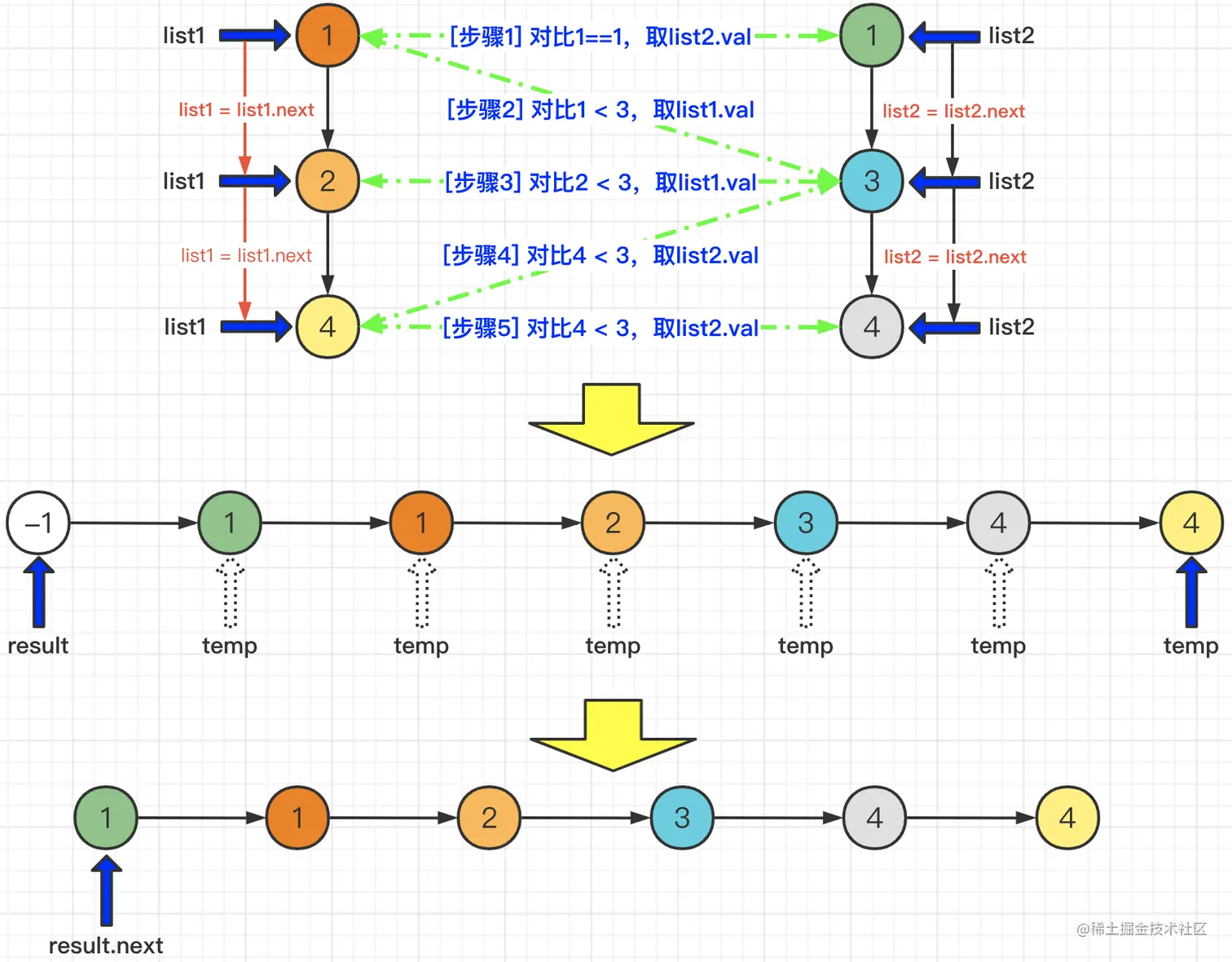 因为题目中已经描述了,list1和list2是两个升序链表。所以,如果要拼装全新的升序列表,只需要对比两个链表中的值即可。此时需要两个指针list1和list2分别指向两个链表的对比节点。当对比出较小值时,则创建新节点new ListNode(list1.val 或 list2.val),并拼装成为新的链表。对于新的链表,创建时result指向头节点,默认值为-1,temp指针指向当前赋值节点,当需要拼接新的链表时,可以通过temp.next = new ListNode(list2.val)和temp = temp.next来构造新的链表。具体逻辑如下图所示:
