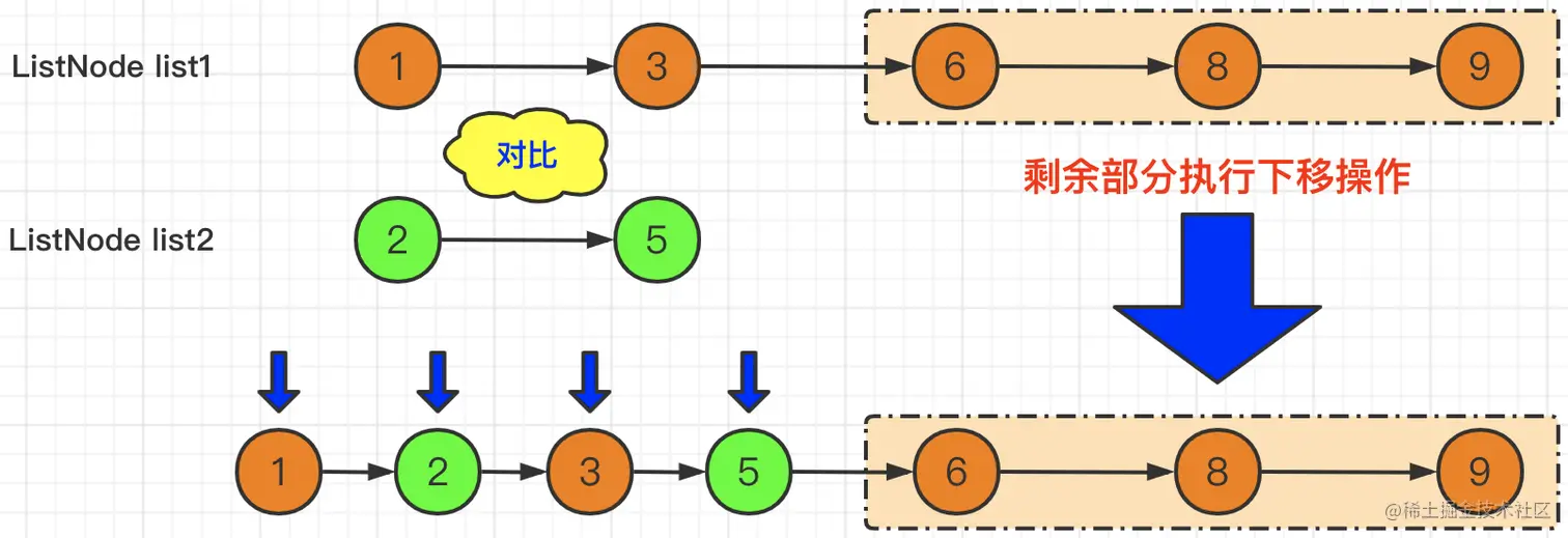 当list1和list2长度不同的时候,为了简化操作,可以将“多余”的部分直接拼装到新链表即可。如下图所示: