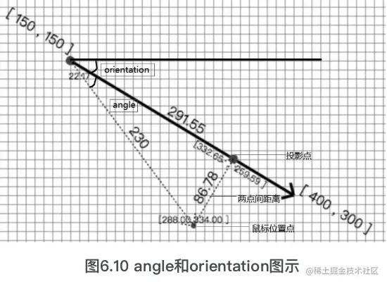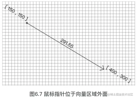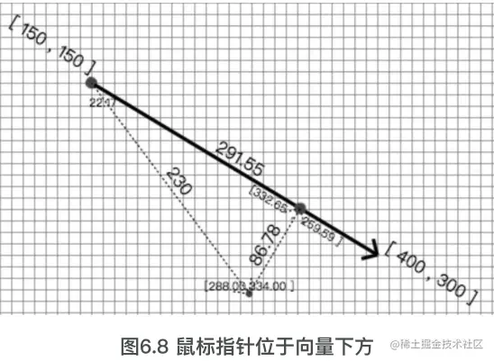 图6.7和图6.8所示的效果是经典的向量投影算法。简单地说,就是将一个点(鼠标位置表示)投影到由起点和终点所形成的向量上。该算法比较常用,伪代码如下: