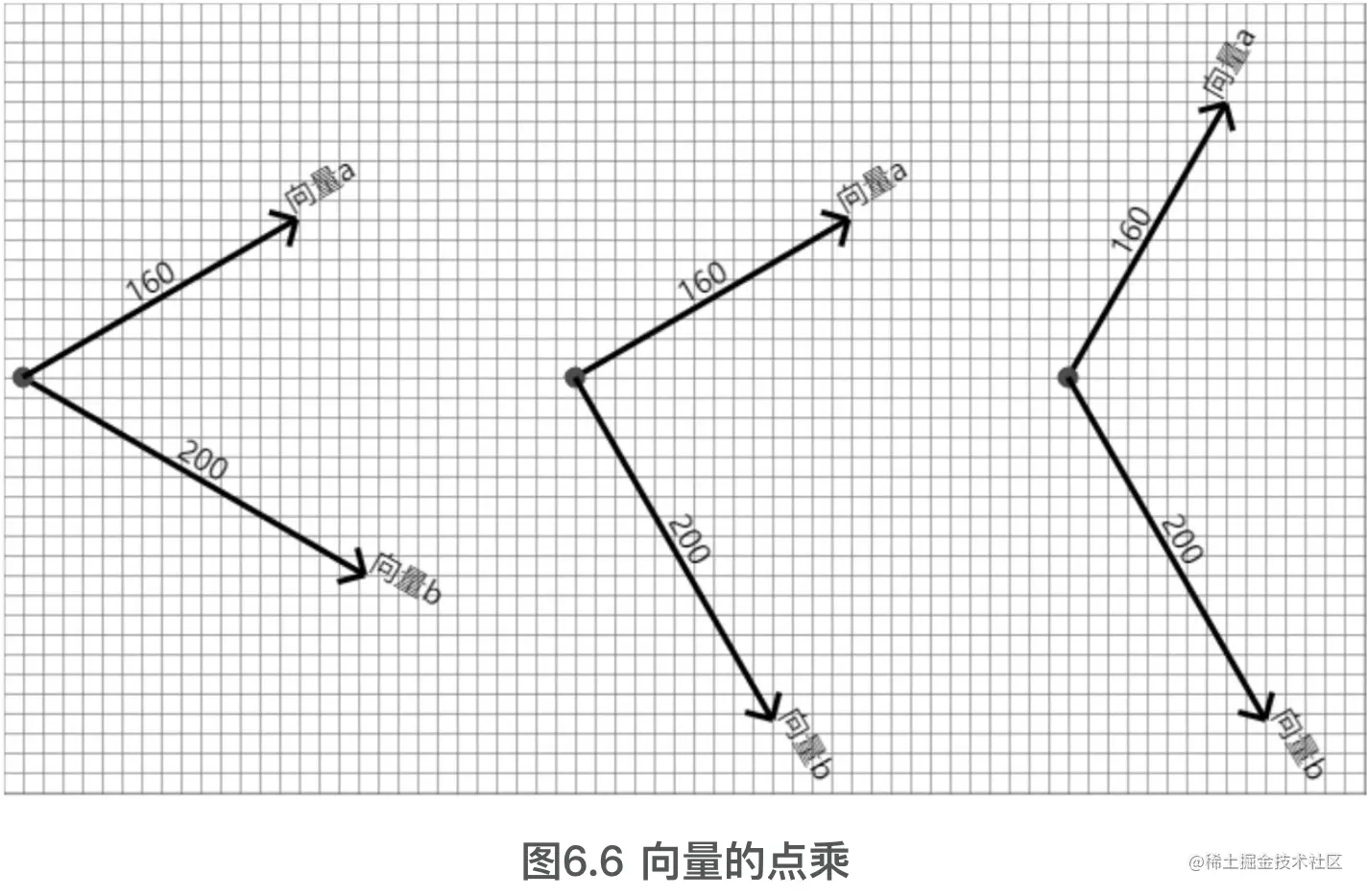- 当a·b = 0时,向量a和b的夹角θ为直角(因为Math . PI / 2的余弦值等于0),可以认为两个向量相互垂直,如图6.6中间所示的图示。