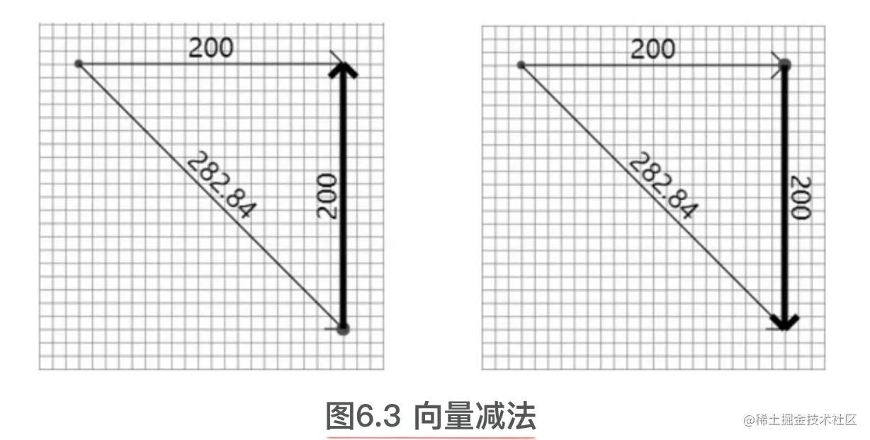 - 向量b(实线且大小为282.84)减去向量a(实线且大小为200),则从向量a(实线且大小为200)的头部向着向量b(实线且大小为282.84)的头部画一个新的向量(粗线且大小为200),如图6.3右图所示。
