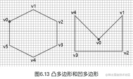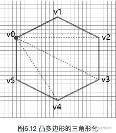 参考图6.13会发现,左侧的凸多边形(六边形)顶点形成的6个子三角形分别是[ v0, v1 , v2 ]、[ v1 , v2 , v3 ]、[ v2 , v3 , v4 ]、[ v3 , v4 , v5 ]、[ v4 , v5 , v0 ]和[v5 , v0 , v1 ],这6个子三角形顶点的顺序都是顺时针排列的。