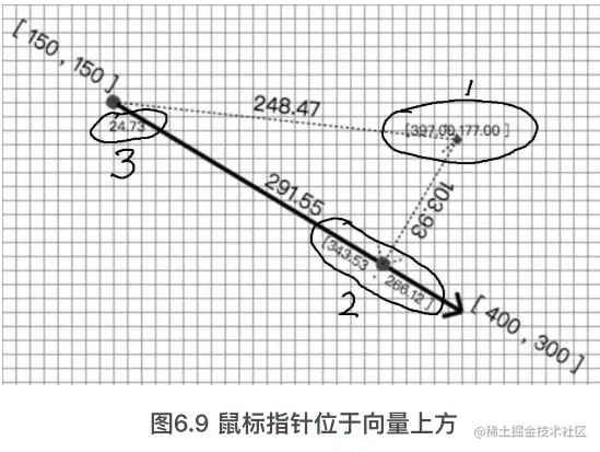 (2)标记出鼠标指针位置在向量上的投影点(圆圈),坐标信息,以及从投影点到鼠标指针位置之间的向量。