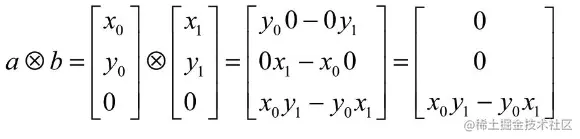 为了将2D向量vec2以3D向量的形式来表示,可以将3D向量的z分量设置为0,例如a=[x0, y0,0], b=[x1, y1,0],套用上述叉积公式,会得到: