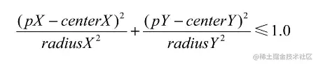 假设椭圆的中心点定义的坐标值为[ centerX,centerY ],并且半径分别为[ radiusX , radiusY ],在这种情况下,一个点P ( pX ,pY )如果在椭圆的内部,那么要满足如下公式: