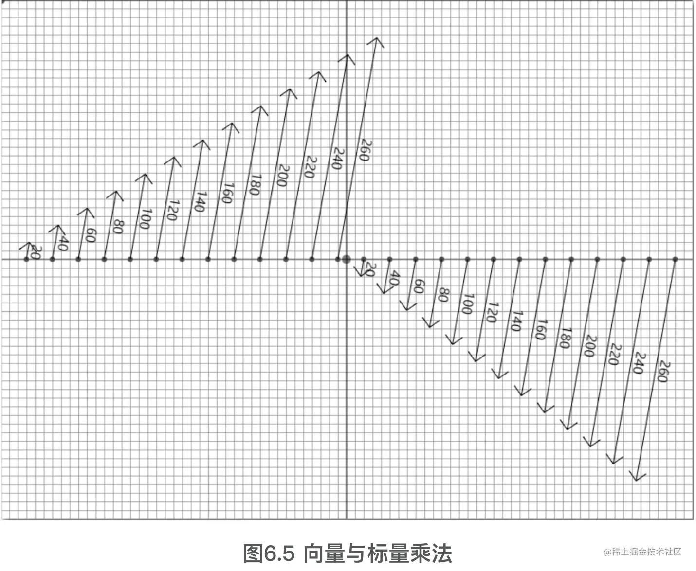 向量与标量不能相加,但是它们能相乘。当一个标量和一个向量相乘时,将得到一个新的向量,该向量与原向量平行,但长度不同或方向相反。如图6.5所示,画布中心左侧的向量的方向都是相同的(平行),向量的大小则以每20个单位递增。而画布中心右侧的向量,方向相反(仍旧平行),其大小也是以每20个单位递增。