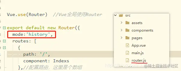 vue去掉路由中#号 兰颜 2022-07-18 75 阅读1分钟 本文已参与「新人创作礼」活动, 一起开启掘金创作之路。 编辑 使用版本 "element-ui": "^2.15.3", "vue": "^2.6.11", "vue-router": "^3.5.2", vue-cli:3 找到路由文件 编辑 添加以下代码 mode:'history', 3. 效果如下 编辑 \