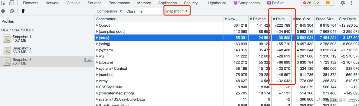 浏览器控制台memory自带的take snapshot, 对比堆快照查看。但是难度很大,增加的地方很多,每一个增加的类型里面东西都很多,完全看不出来泄漏点,各种找错方向。