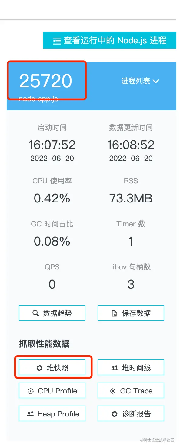 在平台找到实例,node进程,查看内存等数据,打印堆快照