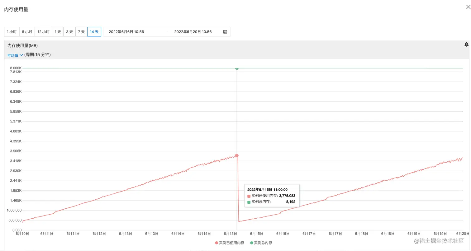 从内存使用图中,能很直观看出内存不断上升。重启后又继续一直增加。