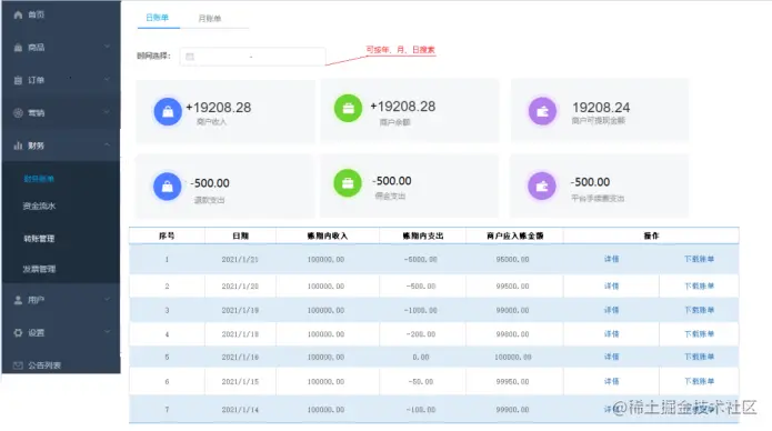 平台后台与商户后台 均可自动显示日账单、月账单,方便查看账单详情,下载账单明细;