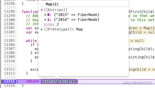 比如我们在数组前塞了一个key=2014的新节点,react在第一次对比是,发现2014! == 2015,外加上这块又是数组diff的逻辑,所以react会猜测你是不是在数组前面或者中间插入了元素,从而导致key不同,因此才会调用mapRemainingChildren提前把旧fiber存入map。