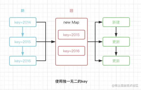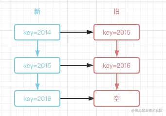 第一次对比时,由于2014 !== 2015,react就会想,你小子是不是在数组前或者数组中间插入了新元素了,为了避免逐层对比导致接下来的每个节点都要重新创建,此时会跳出之前的diff逻辑来到mapRemainingChildren方法,然后把旧节点存在map中,之后再借用map + key来达到旧节点的对比与复用。