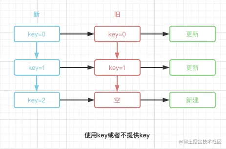 其实说到这里,我想大家对于这个问题应该也有了一定的理解。对于非list结构而言,确实是否提供key并无重要,反正大家都是逐层对比;而对于list而言,当存在数组头部或中间插入元素时,假设大家提供index作为key或者不提供key,都会导致新旧节点的key全部相等。这就导致了已经错位的节点强行逐层对比,本应该新建的节点因为key相同而走了更新,本应该更新的节点因为key相同结果走了新建。