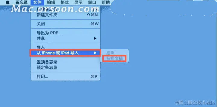 注意:如果装有 macOS 10.14 或更高版本、iOS 12 或更高版本或者 iPadOS 13 或更高版本,也可以直接使用 iPhone 或 iPad 相机扫描文稿。在备忘录中,点按行首,选取“文件”>“从 iPhone 或 iPad 插入”,然后选取“扫描文稿”以使用 iPhone 或 iPad 扫描文稿并将其插入到备忘录中。