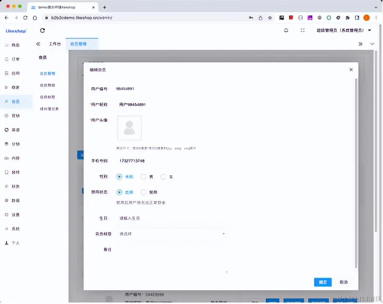 运营人员可以通过点击编辑按钮,调整会员的基本信息,包括昵称、头像、手机号码,并且可以设置禁用状态。