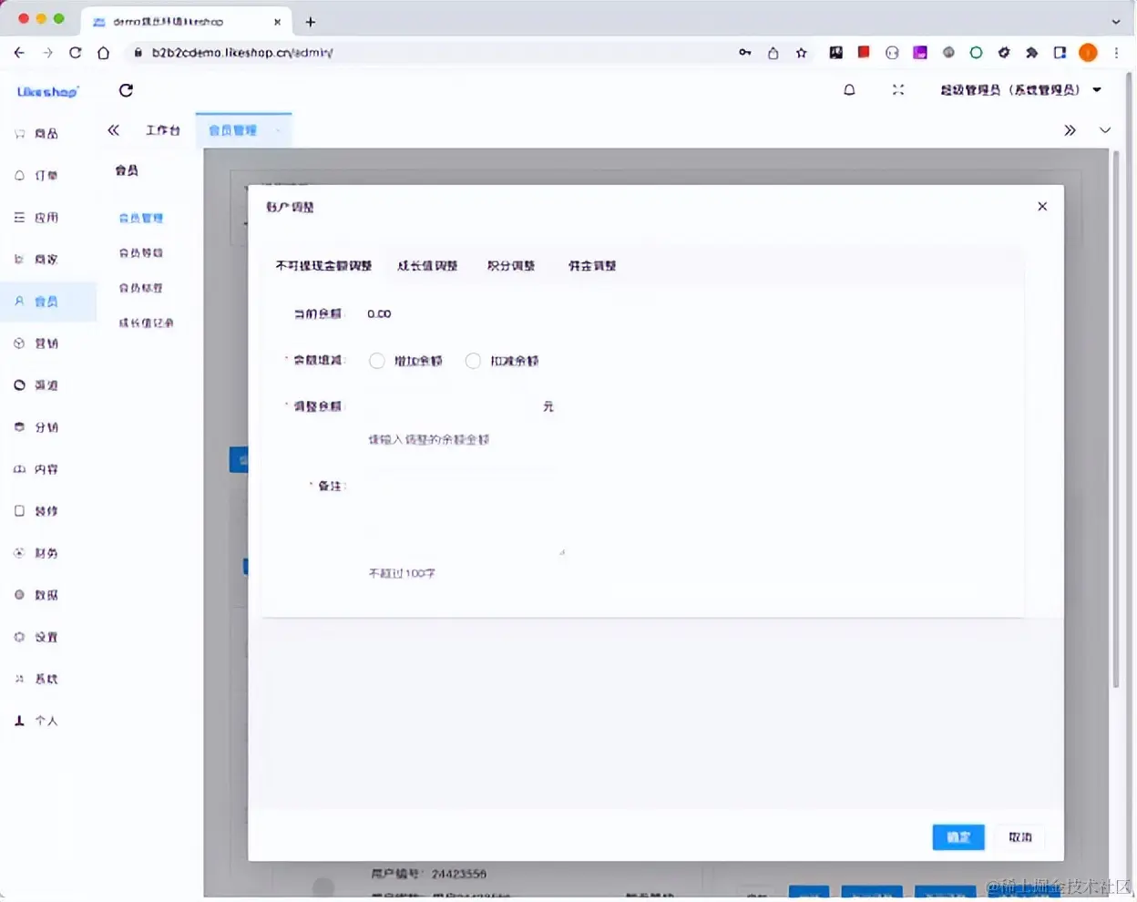 当运营需要调整会员的钱包资产时,可以点击账户调整功能。账户调整包含:不可提现金额调整(也即钱包余额),成长值调整,积分调整,佣金调整四个方面,满足了很多的运营场景。