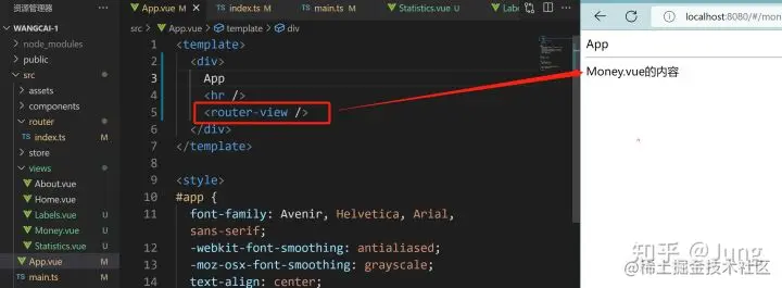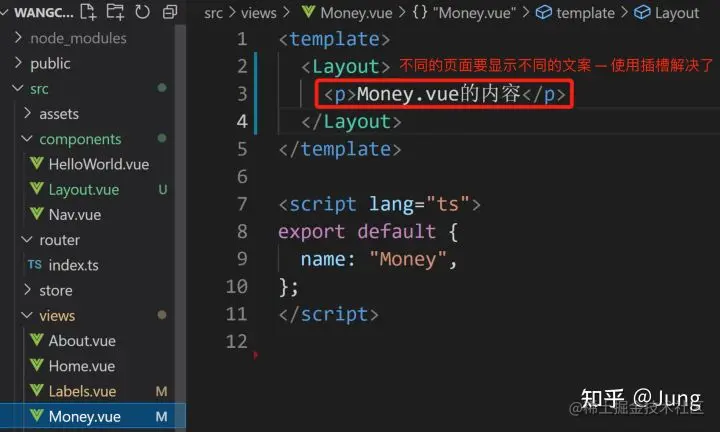 需求:不同页面插入的文案不同,比如Money.vue的文案是“此页面是Money.vue的内容”,而Labels页面的文案是“此页面是Labels.vue的内容”,不同页面不同文案,这时候可以使用插槽