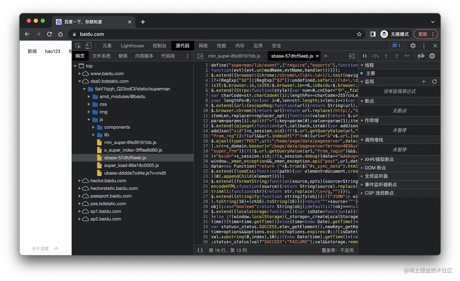 在这里可以断点、单步调试等等,能详细地看到程序的运行状态。此外还有非常实用的 DOM断点、事件断点等功能,在定位特定问题的时候非常好用。其他功能建议去详细了解一下,本文只讲解JS断点调试的部分。
