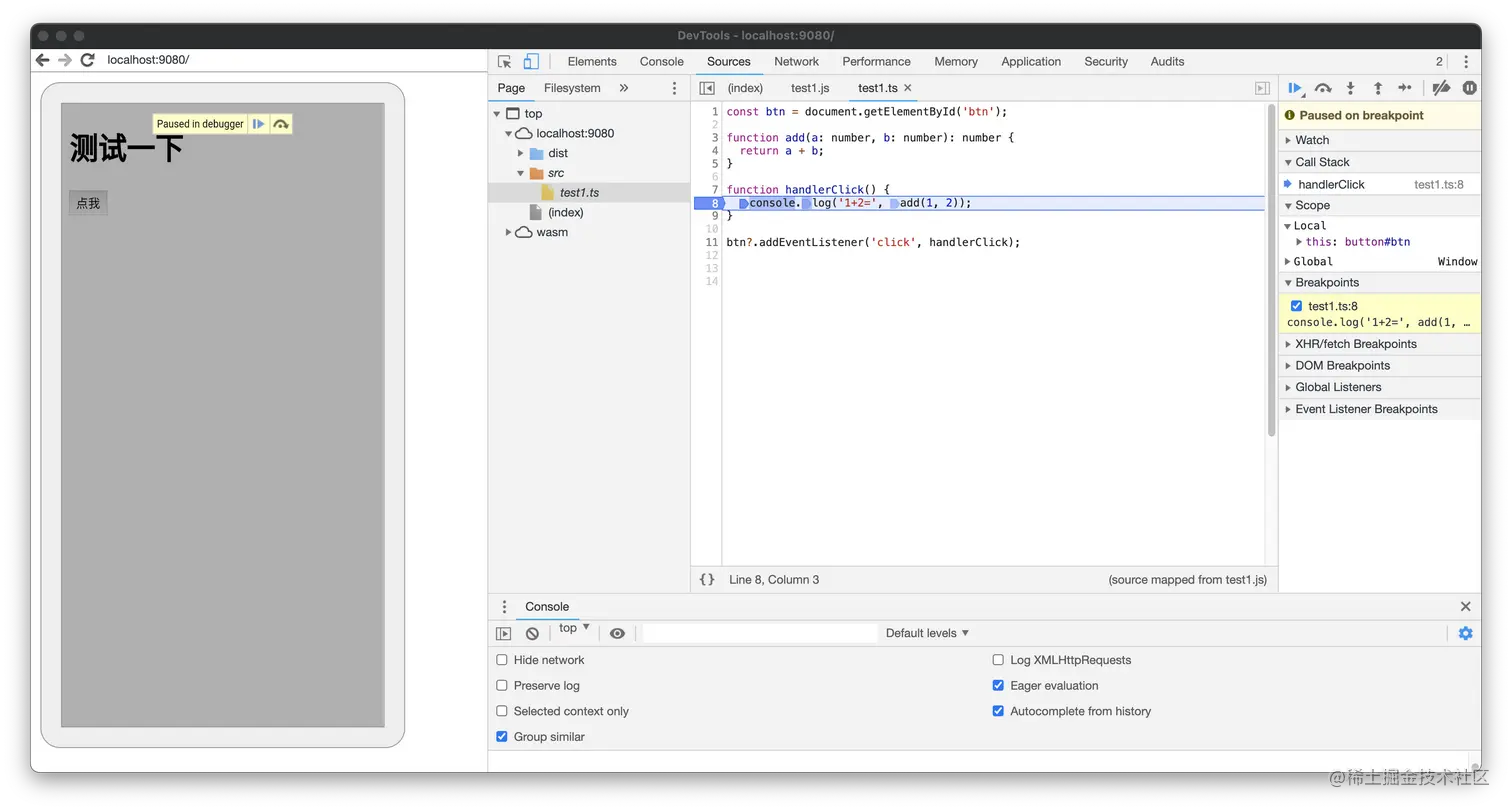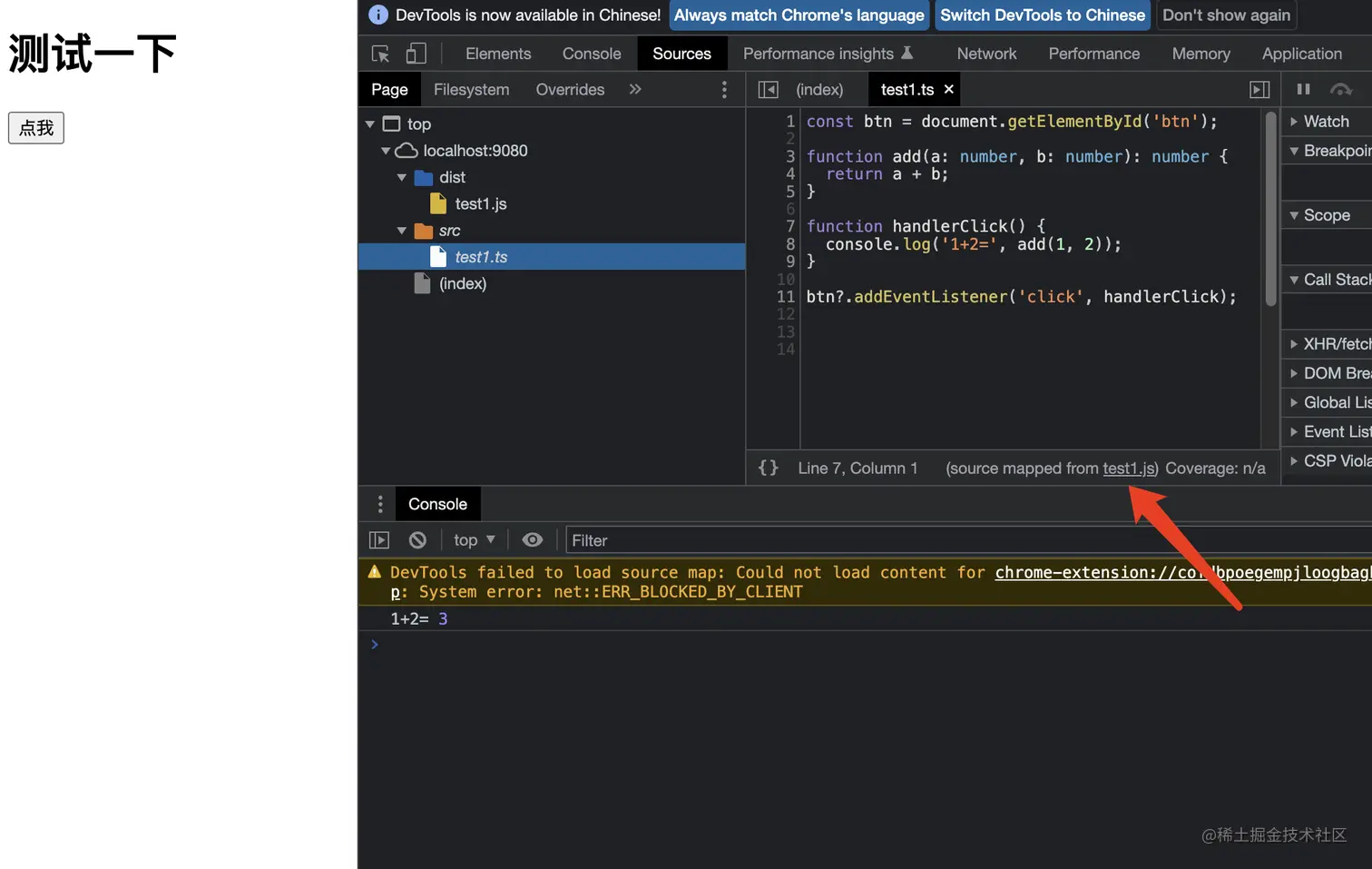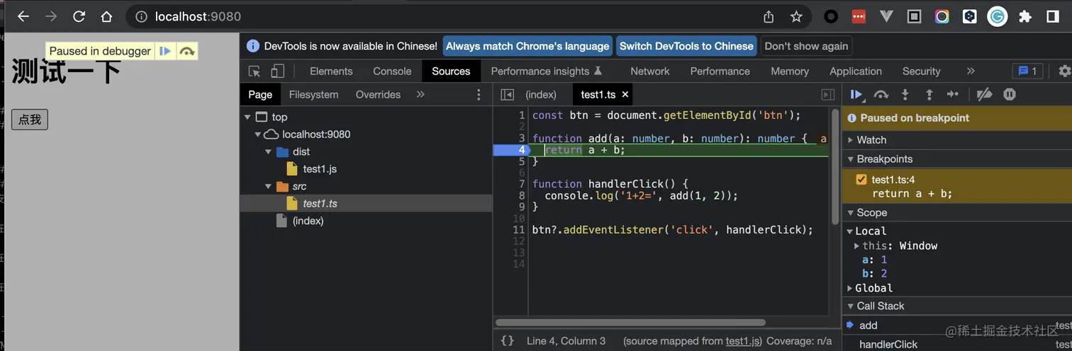 可以看到 Souces面板下的文件目录,会有一个 src/test1.ts 的文件。并且这个文件右下角声明了是“souce mapped from test1.js”。