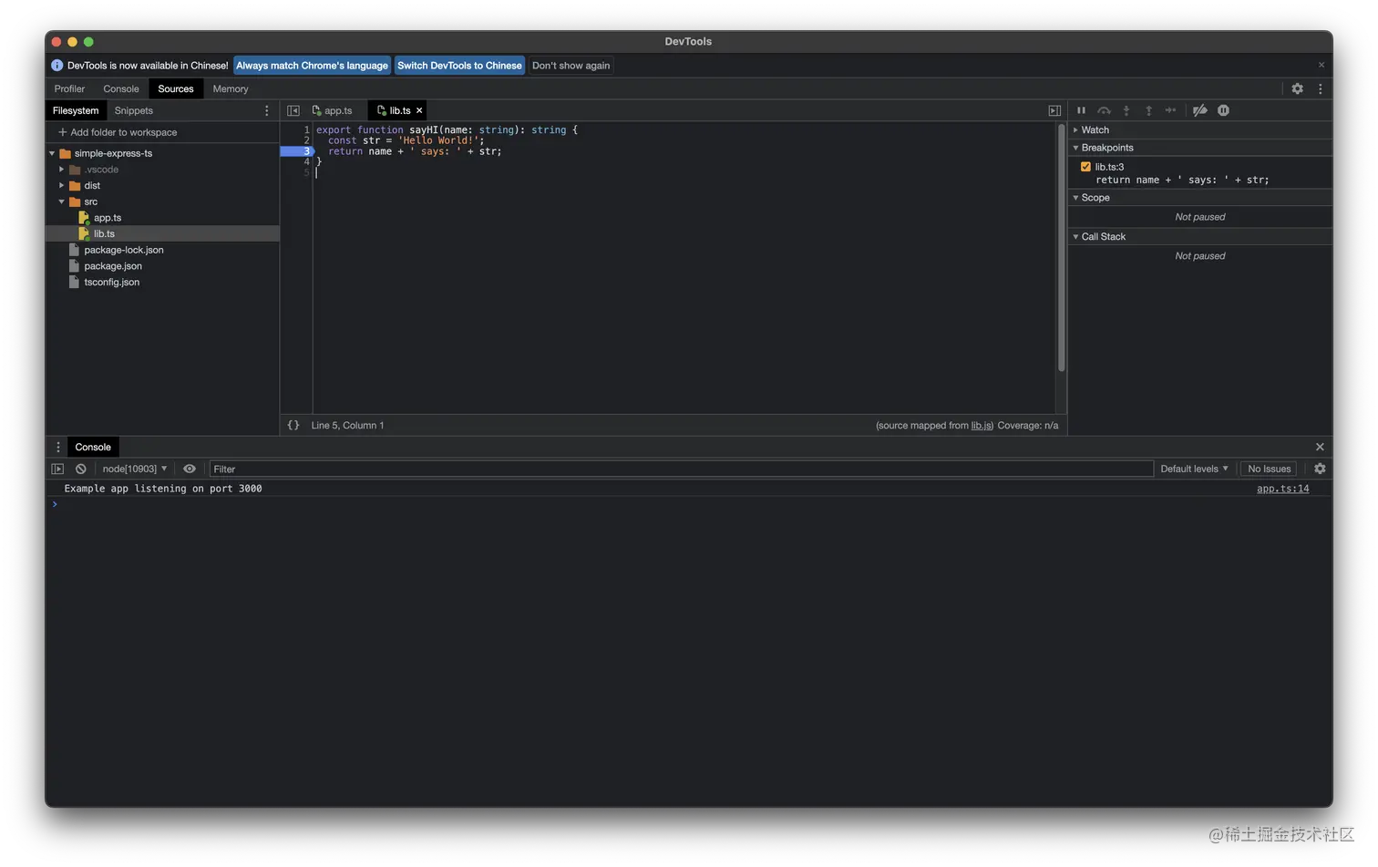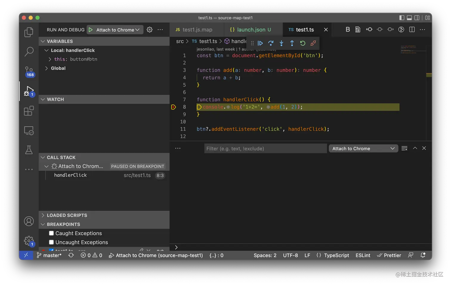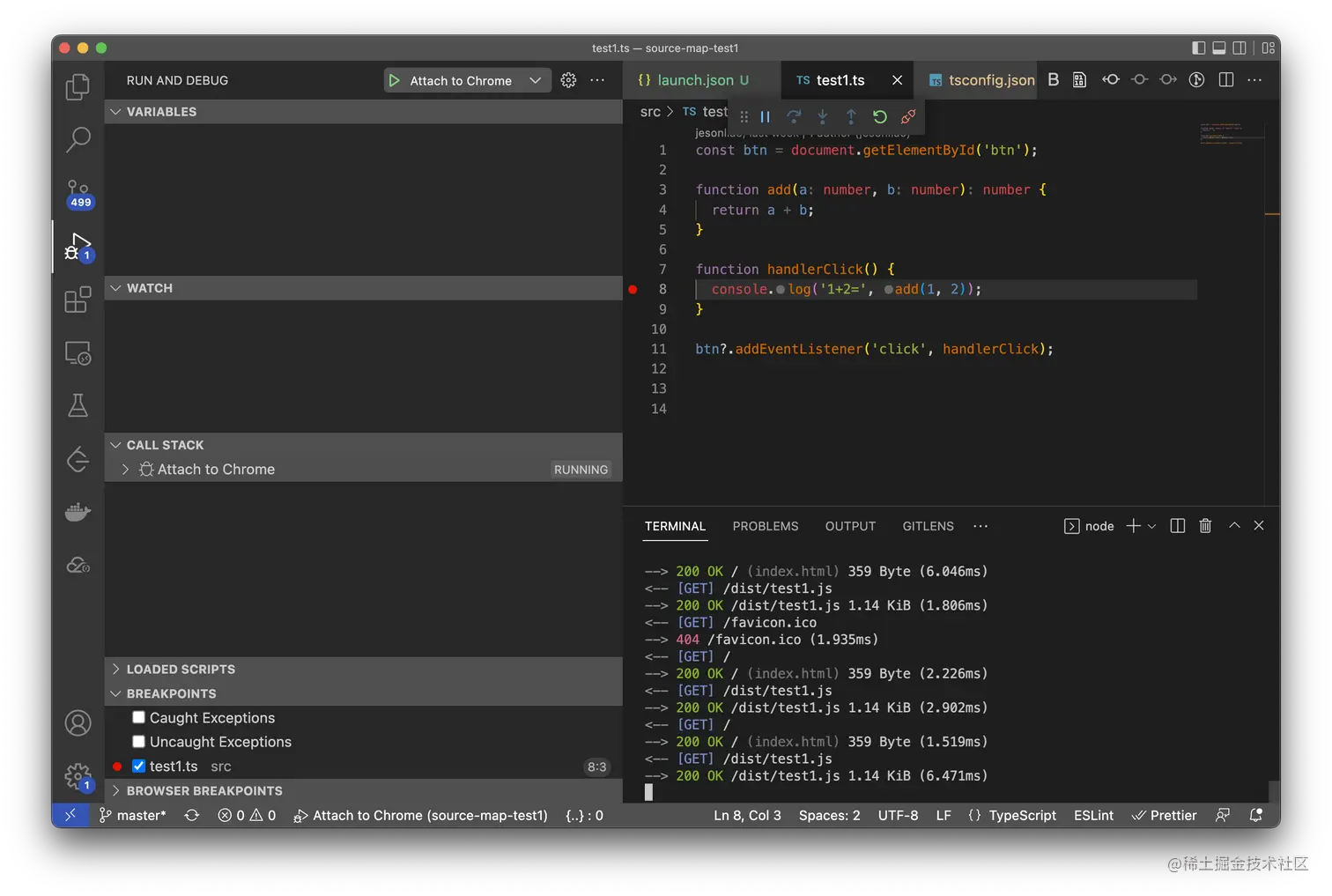 可以看到 Souces面板下的文件目录,会有一个 src/test1.ts 的文件。并且这个文件右下角声明了是“souce mapped from test1.js”。